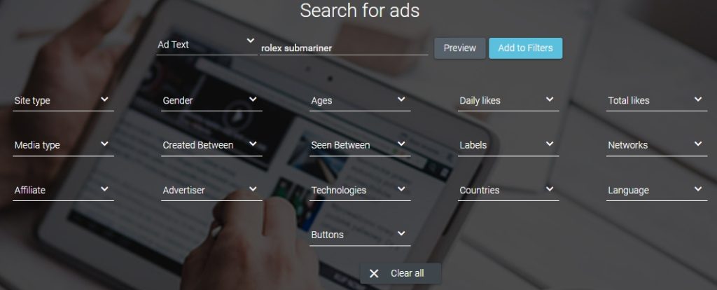 ADSPY allows filtering by gender, age, likes, country, language, and more.