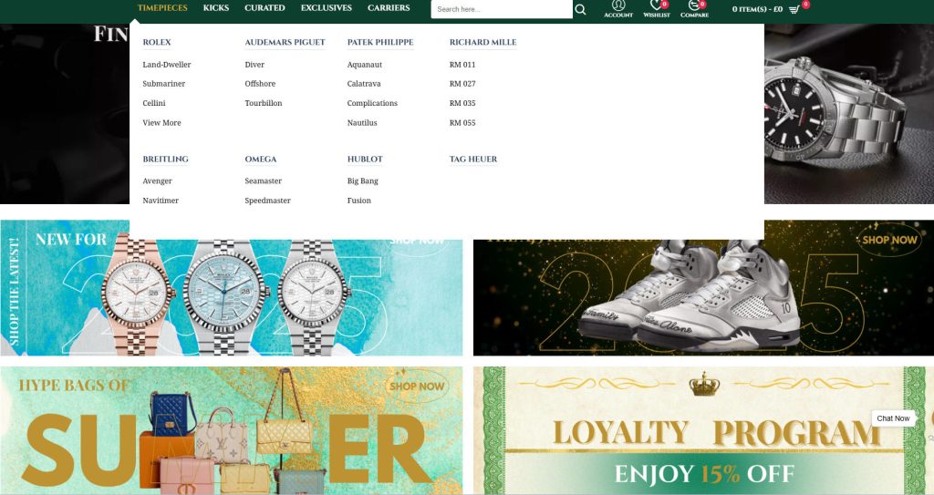 Key categories include sneakers, streetwear, watches, perfumes, and handbags.