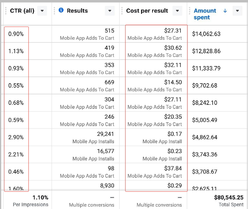 The account spent over $80,000, providing a very large sample size. In this analysis, we chose Mobile App Adds To Cart and used Cost per Result as the core KPI.