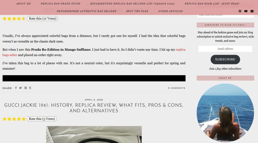 The blog menu is well-structured, featuring sections like Reviews, Recommended Replica Bag Sellers List, Authentic Bag Sellers List, and Fraud Prevention Guides, making site navigation clear and user-friendly.