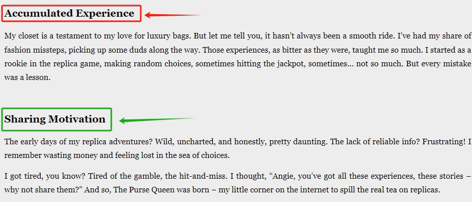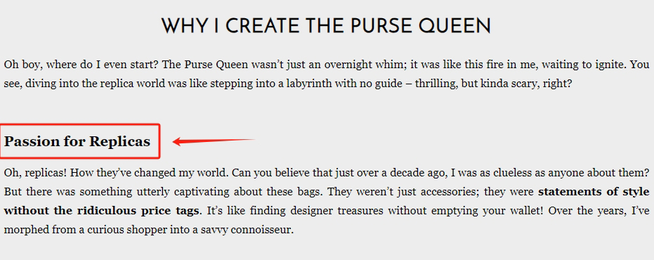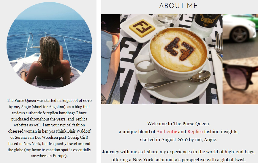 On the ABOUT page, the blogger explains why she started the blog and her motivation. She describes herself as a fashion lover with a passion for replicas, possessing strong skills in identifying authentic and counterfeit products. She has spent a lot of money learning the differences, gaining valuable expertise. Her goal is to help readers avoid mistakes by sharing her insights and recommending high-quality sellers.