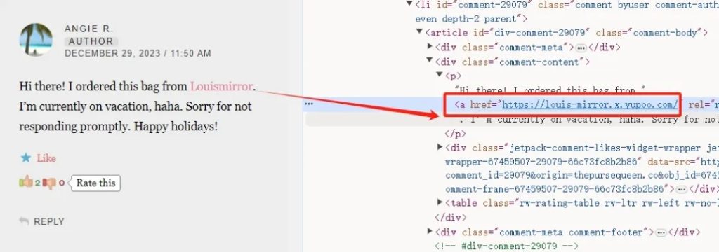 She also provides a link to the replica product landing page for readers to browse and purchase. The featured bag comes from a replica seller’s platform,