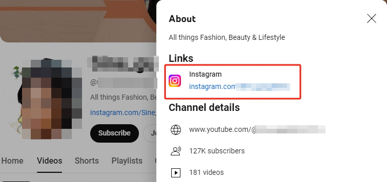 Many influencers link their third-party social media accounts, such as Facebook or Instagram, on their YouTube profile.