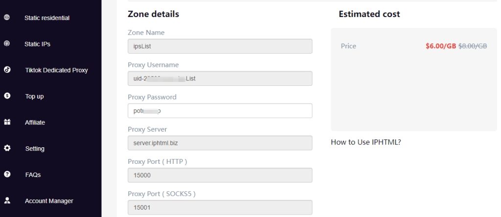 Select IPhtmlauto (IPHTML Dynamic Proxy) in the proxy settings and enter the relevant proxy details.