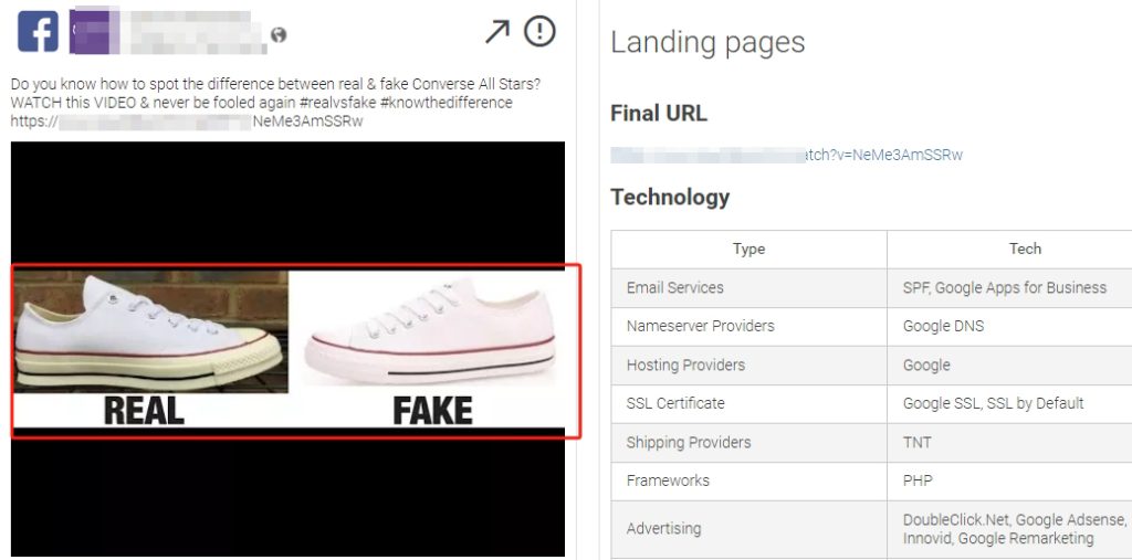 By using the ADSPY tool and searching for “Authentic vs Replica,” we can see that ad copies often use eye-catching words like “REAL” and “FAKE” to attract clicks, ultimately directing traffic to the landing page (Final URL).