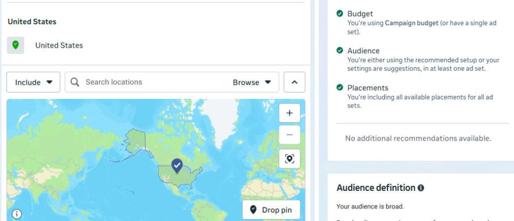 Within each group, we define different audience parameters, such as region and placement. A quick reminder: for replica product standalone stores, ad budgets and audience targeting should align with average order value (AOV). For products with a higher AOV (over a certain USD threshold), the CPC tends to be higher, so I recommend a minimum daily budget of $50 per group for the first round of testing.