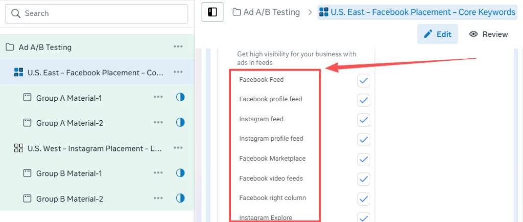 Group A: “U.S. East – Facebook Placement – Core Keywords”