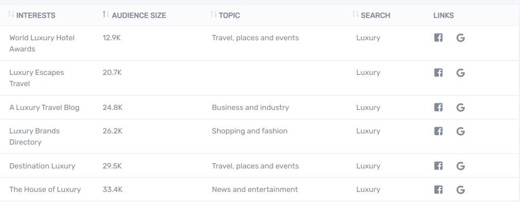 Previously, I recommended a tool called InterestExplorer for interest keyword research. For example, for luxury products, you might start with the core keyword “LUXURY” and then discover related terms to optimize your audience.