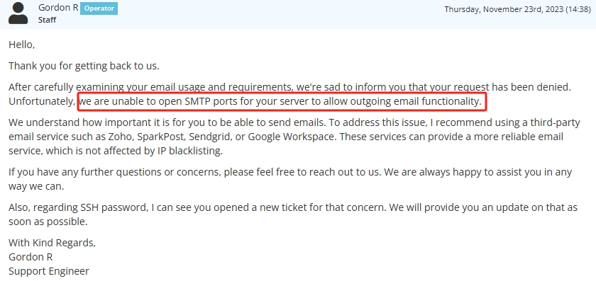 This is absolutely unbelievable — how can a server company block port 465, the standard for sending emails? It clearly shows how weak and unreliable their infrastructure is — so bad it can’t even handle a few standard email messages.