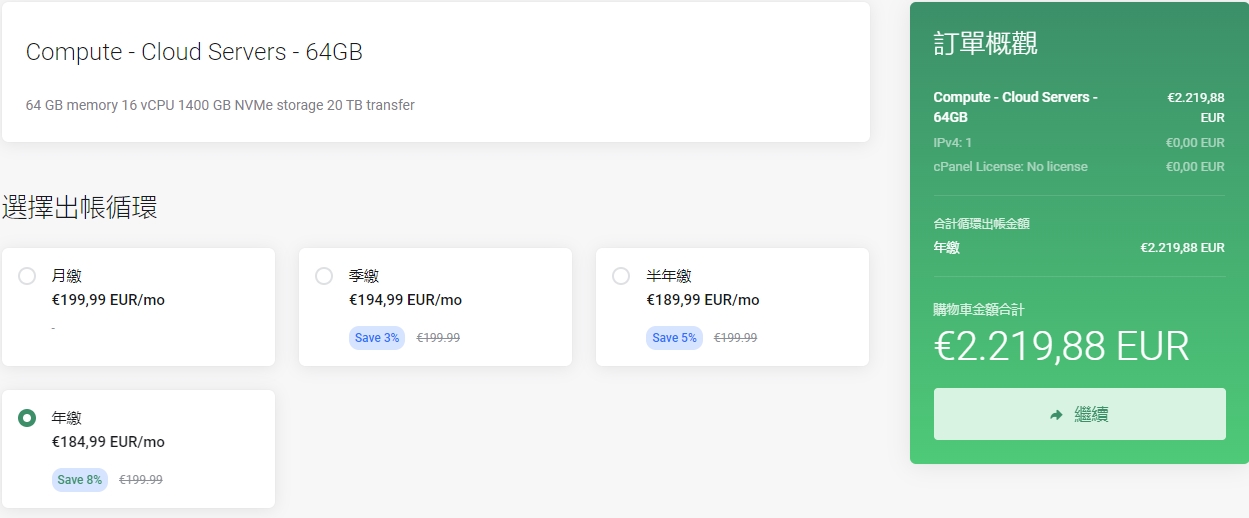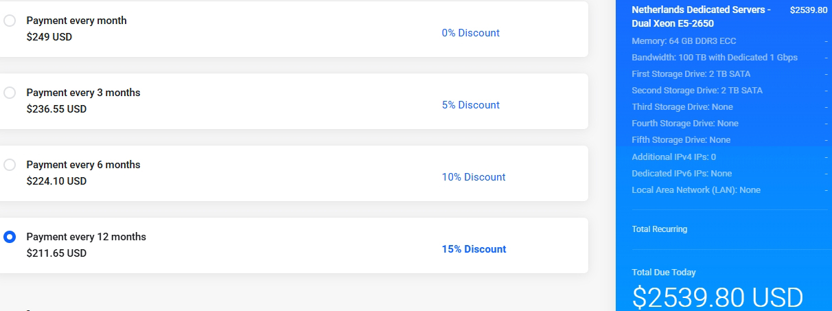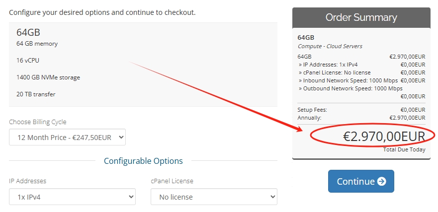 Half a year ago, their pricing was very attractive: a 16-core, 64GB configuration with unlimited bandwidth cost only €2,219.88 per year. They also offered big discounts to attract customers, including a 20% discount that lowered the price to €1,775.90.